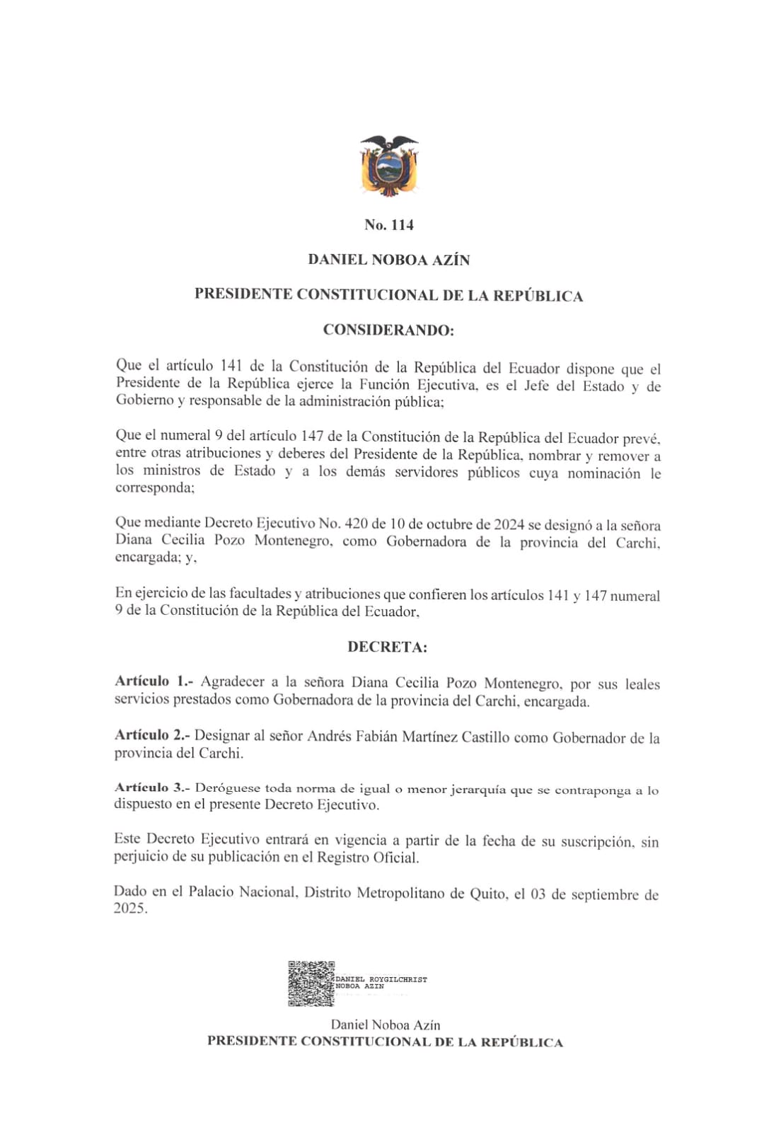 Tulcán; 03/09/2025.– Mediante Decreto Ejecutivo N°114, firmado por el Presidente de la República Daniel Noboa Azín, del 03 de Septiembre del 2025, designa a Andrés Fabián Martínez Castillo, como nuevo gobernador de la provinica de Carchi.
